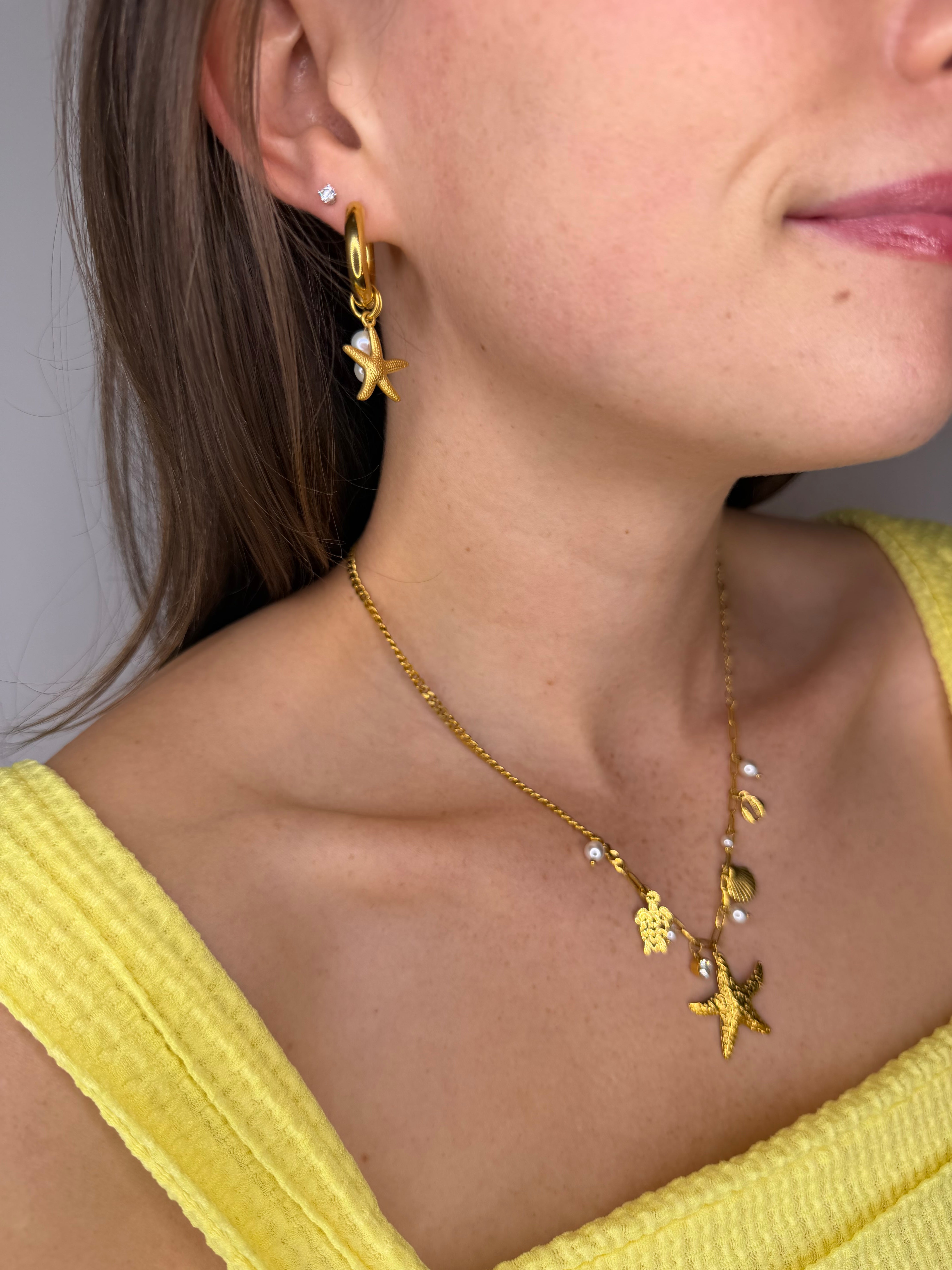 Lleva contigo un poco de sol y la magia del mar a dondequiera que vayas con nuestro Collar con Dije Marea Dorada. Esta delicada cadena dorada está adornada con dijes inspirados en el océano, como una estrella de mar texturizada, una concha, una tortuga marina y delicadas perlas, que capturan la belleza despreocupada de los días de verano en la playa. Perfecto para combinar con otros collares o lucirlo solo, añade un toque de encanto costero a cualquier atuendo.