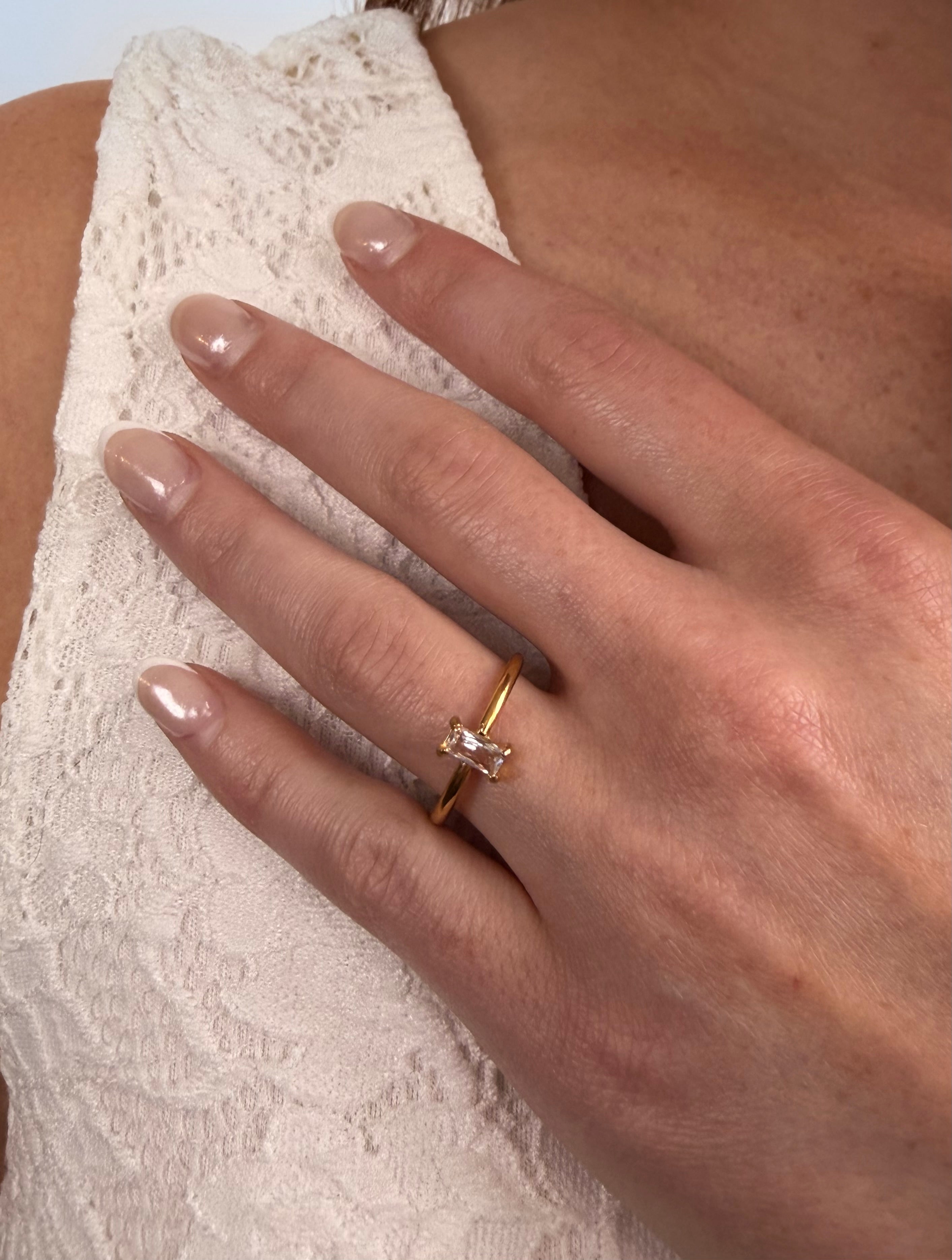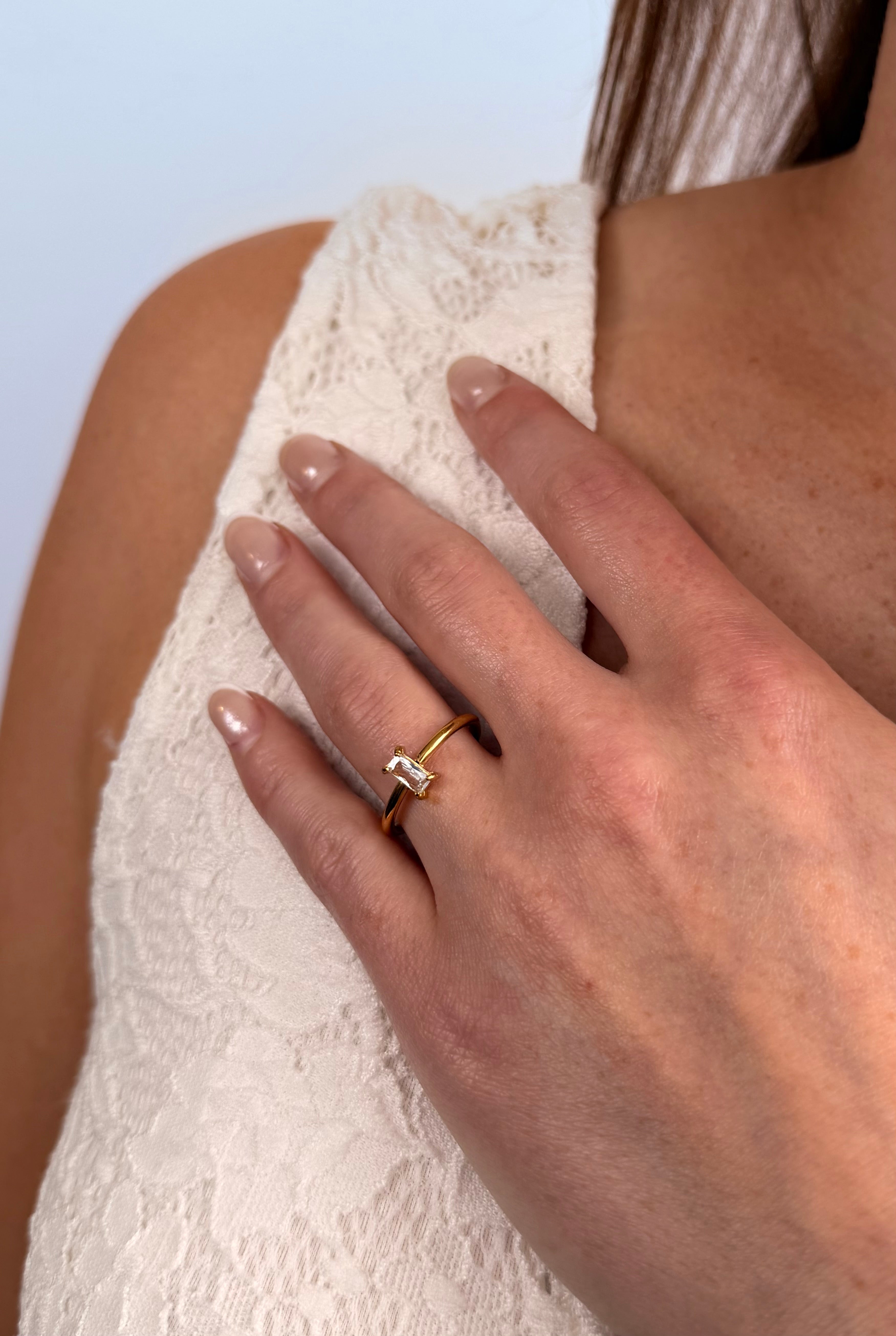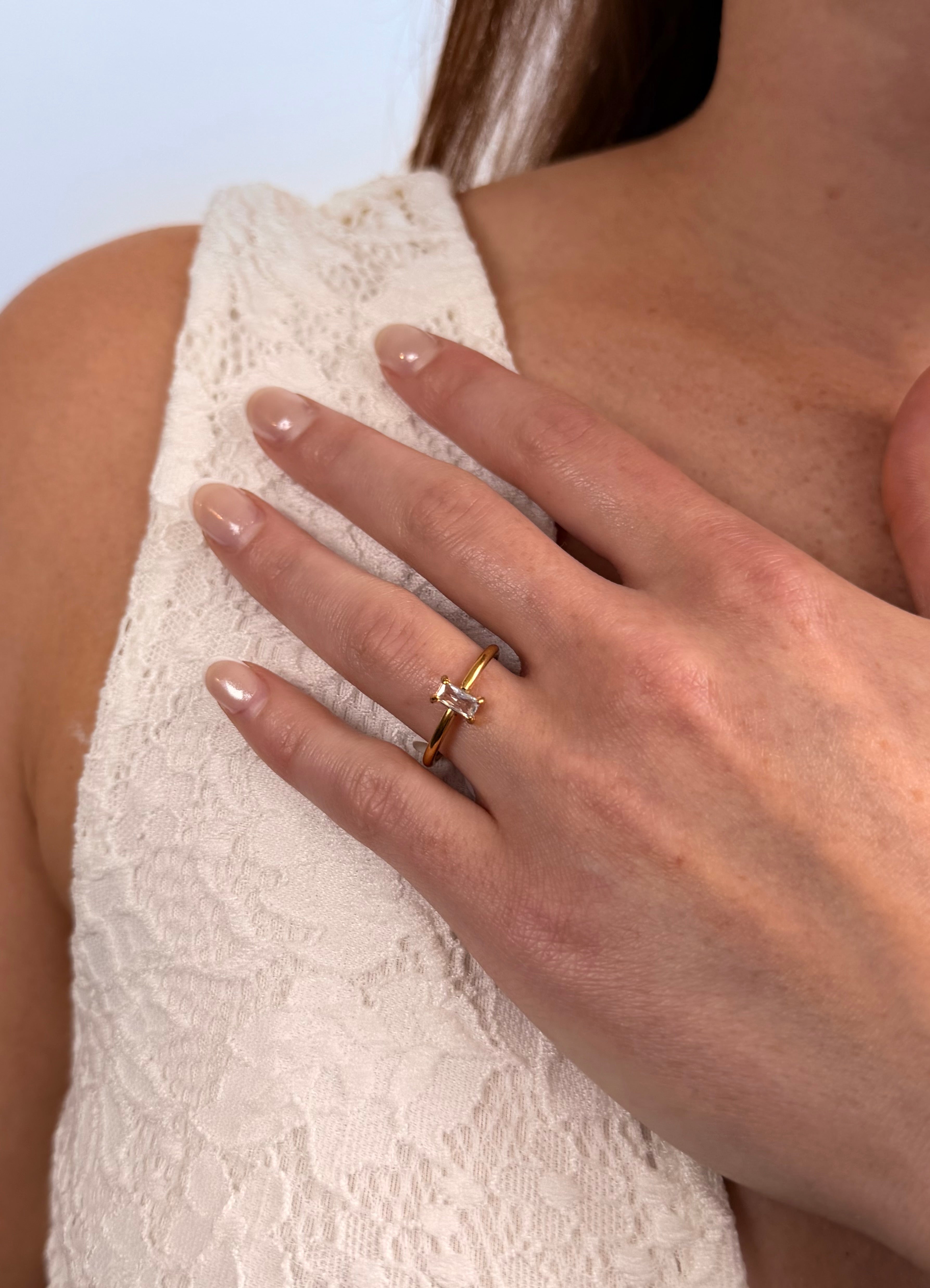 Los anillos Horizon Dainty aportan líneas limpias y modernas a la colección de Oshena, inspirada en el océano. Cada anillo luce una radiante piedra talla baguette engastada en una fina banda de acero inoxidable con baño de oro PVD de 18k: un equilibrio entre sencillez y brillo que refleja el horizonte donde el mar se une con el cielo.