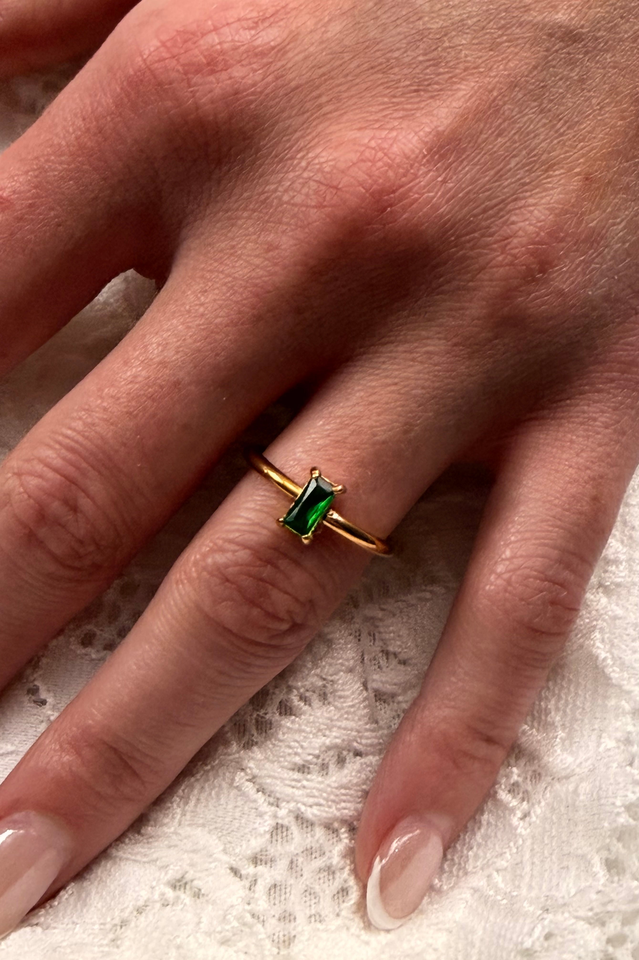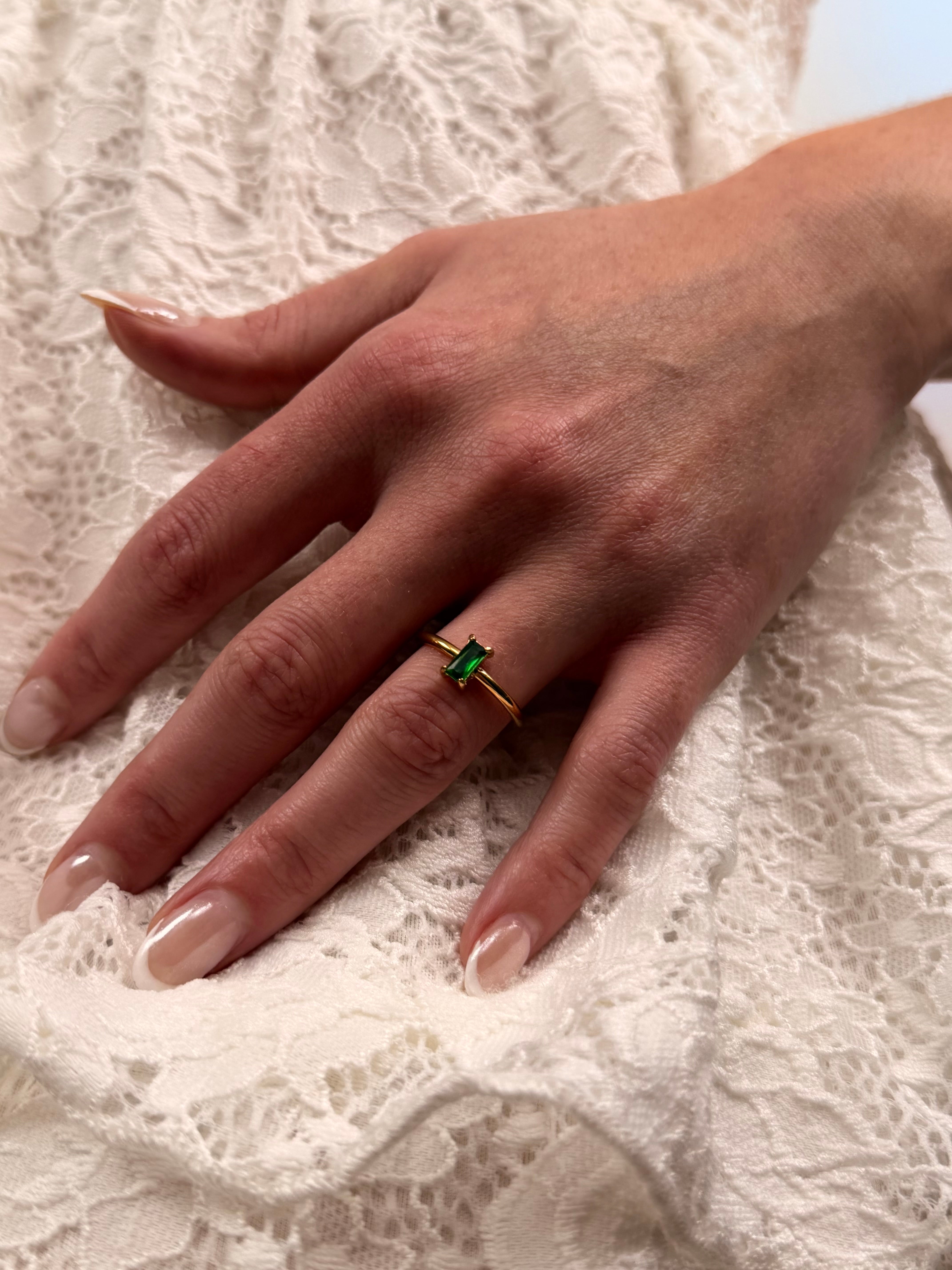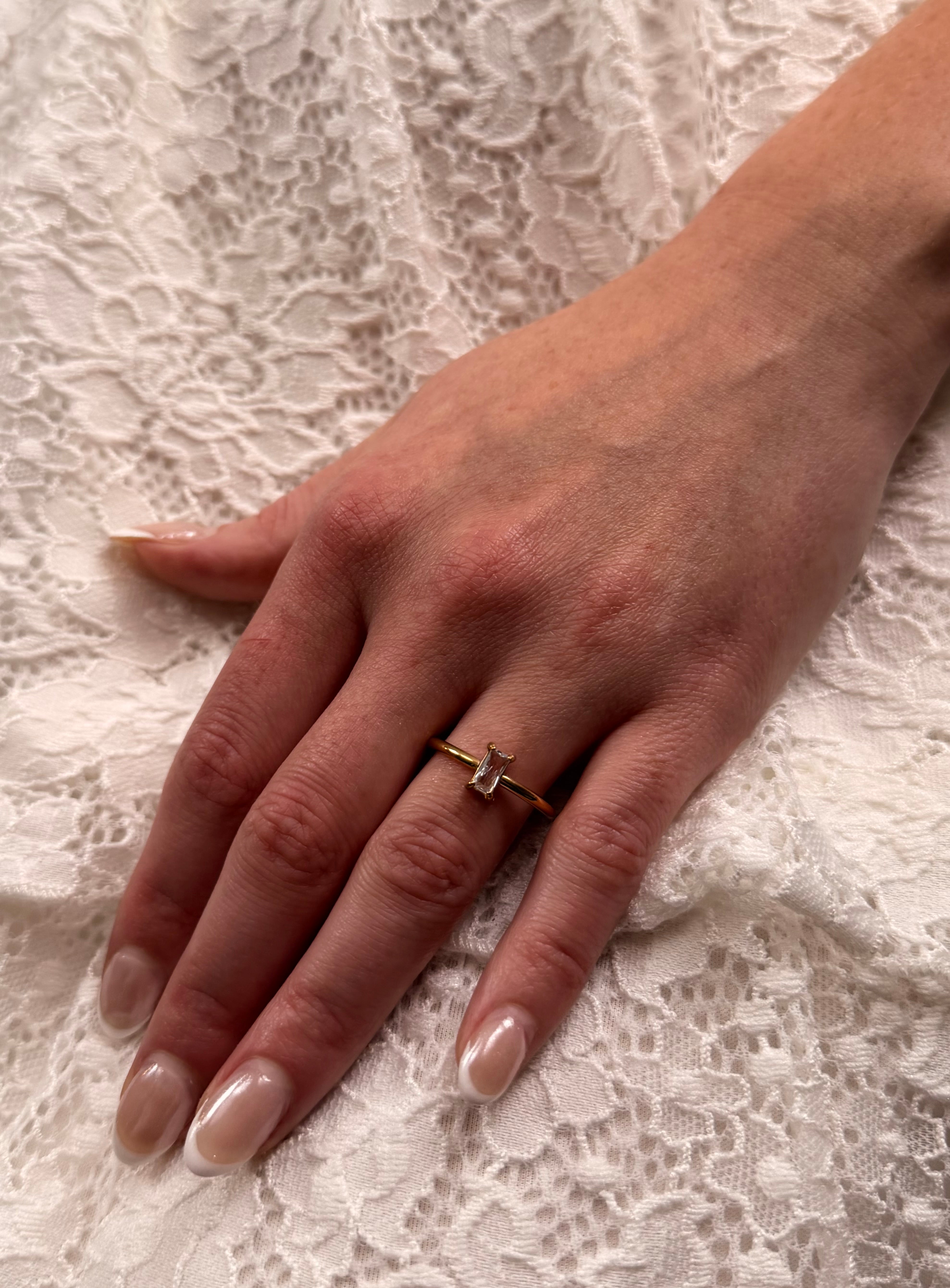 Los anillos Horizon Dainty aportan líneas limpias y modernas a la colección de Oshena, inspirada en el océano. Cada anillo luce una radiante piedra talla baguette engastada en una fina banda de acero inoxidable con baño de oro PVD de 18k: un equilibrio entre sencillez y brillo que refleja el horizonte donde el mar se une con el cielo.