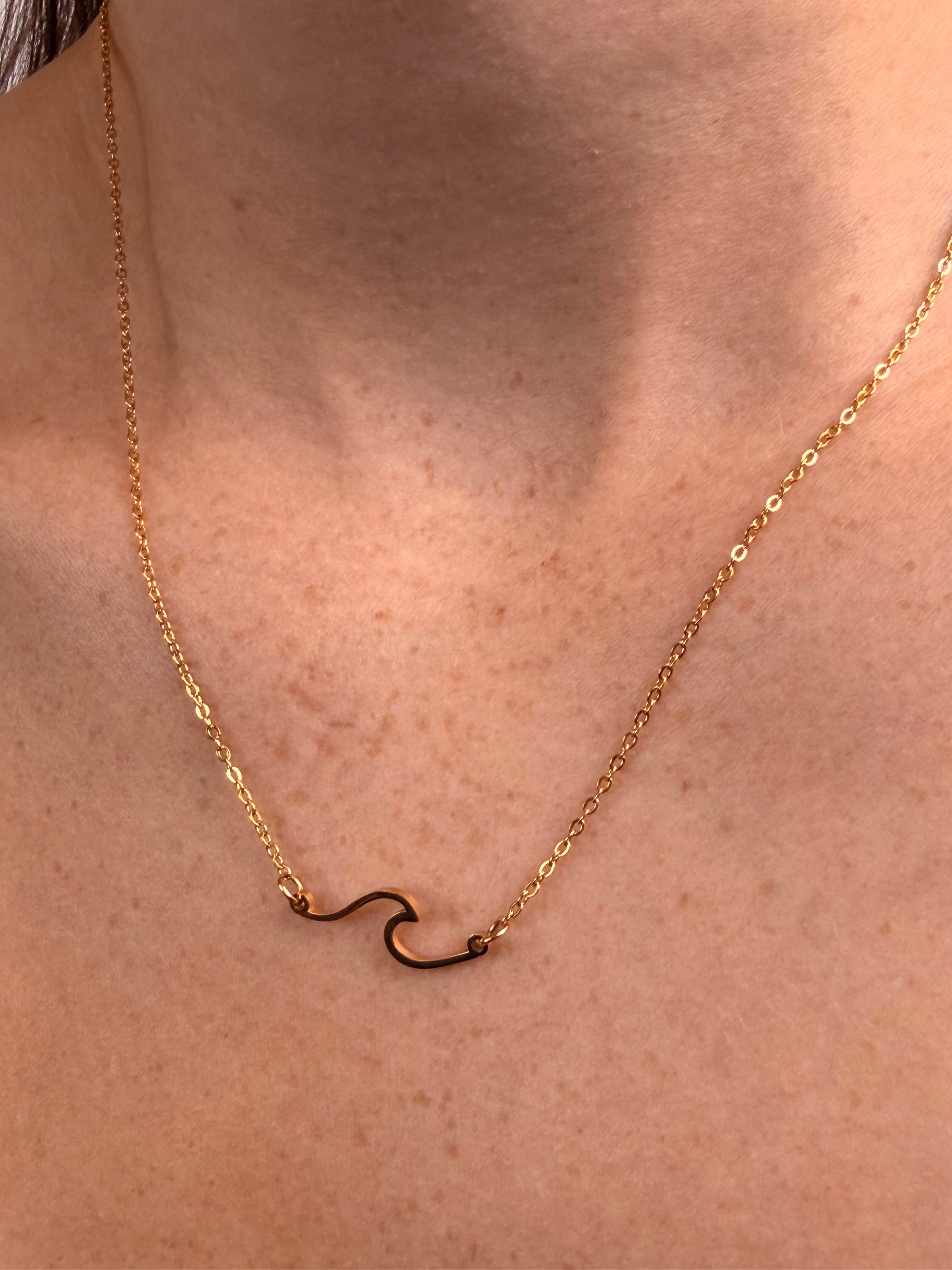 El collar Sol Wave condensa el océano en una sola curva fluida. Elaborado en oro PVD de 18k sobre acero inoxidable, este colgante minimalista captura la serenidad y la fuerza del mar con un estilo natural.