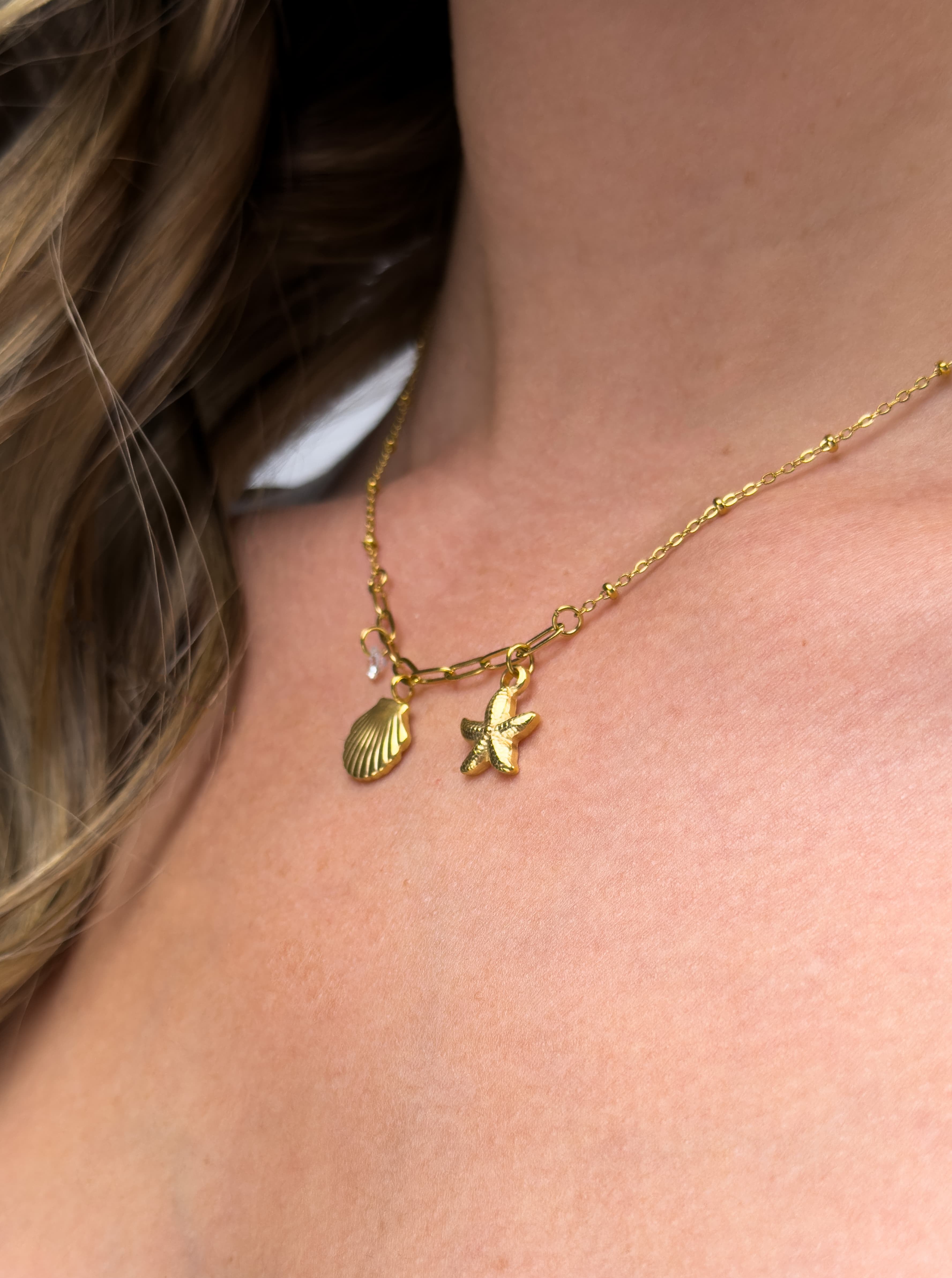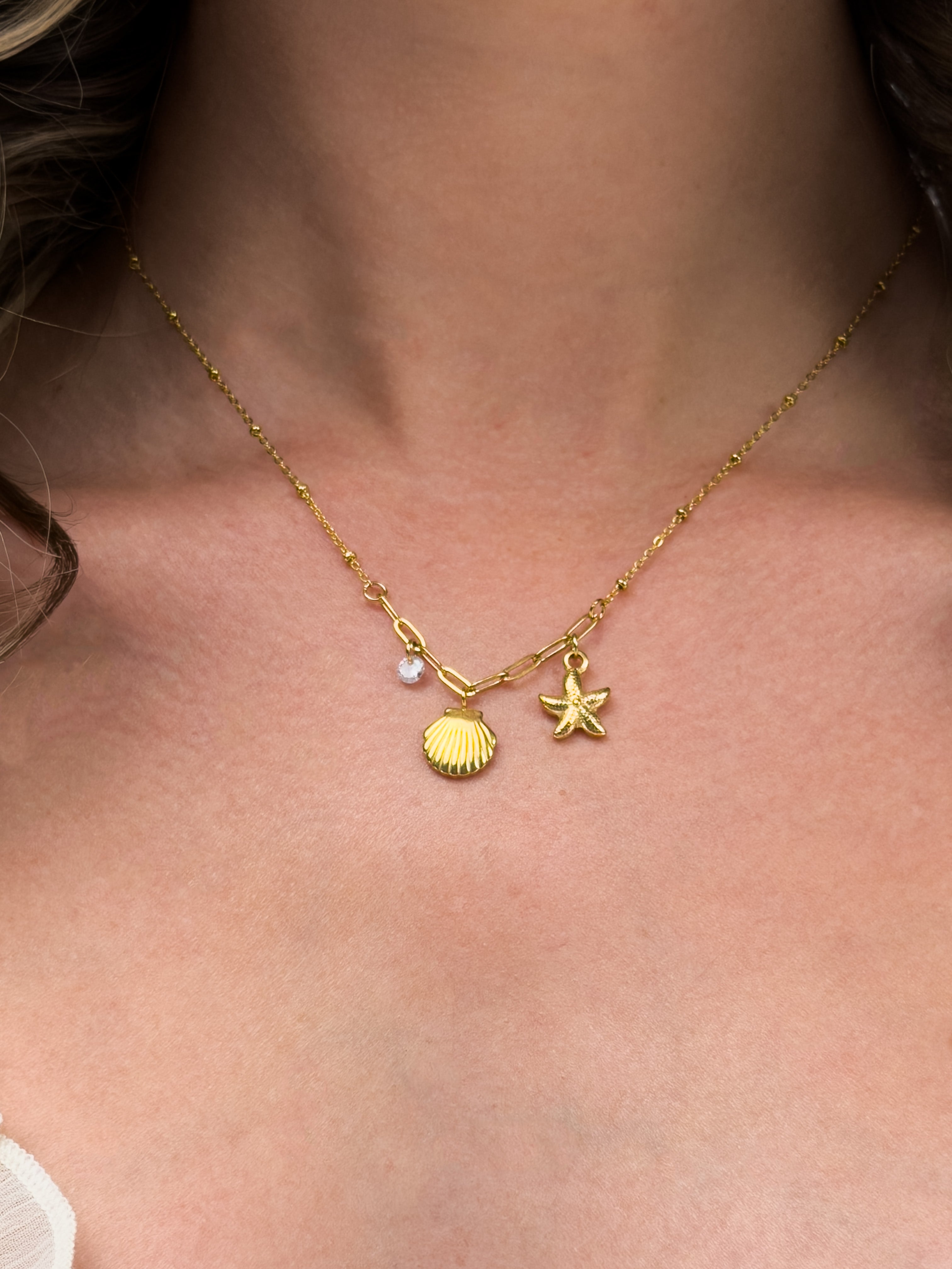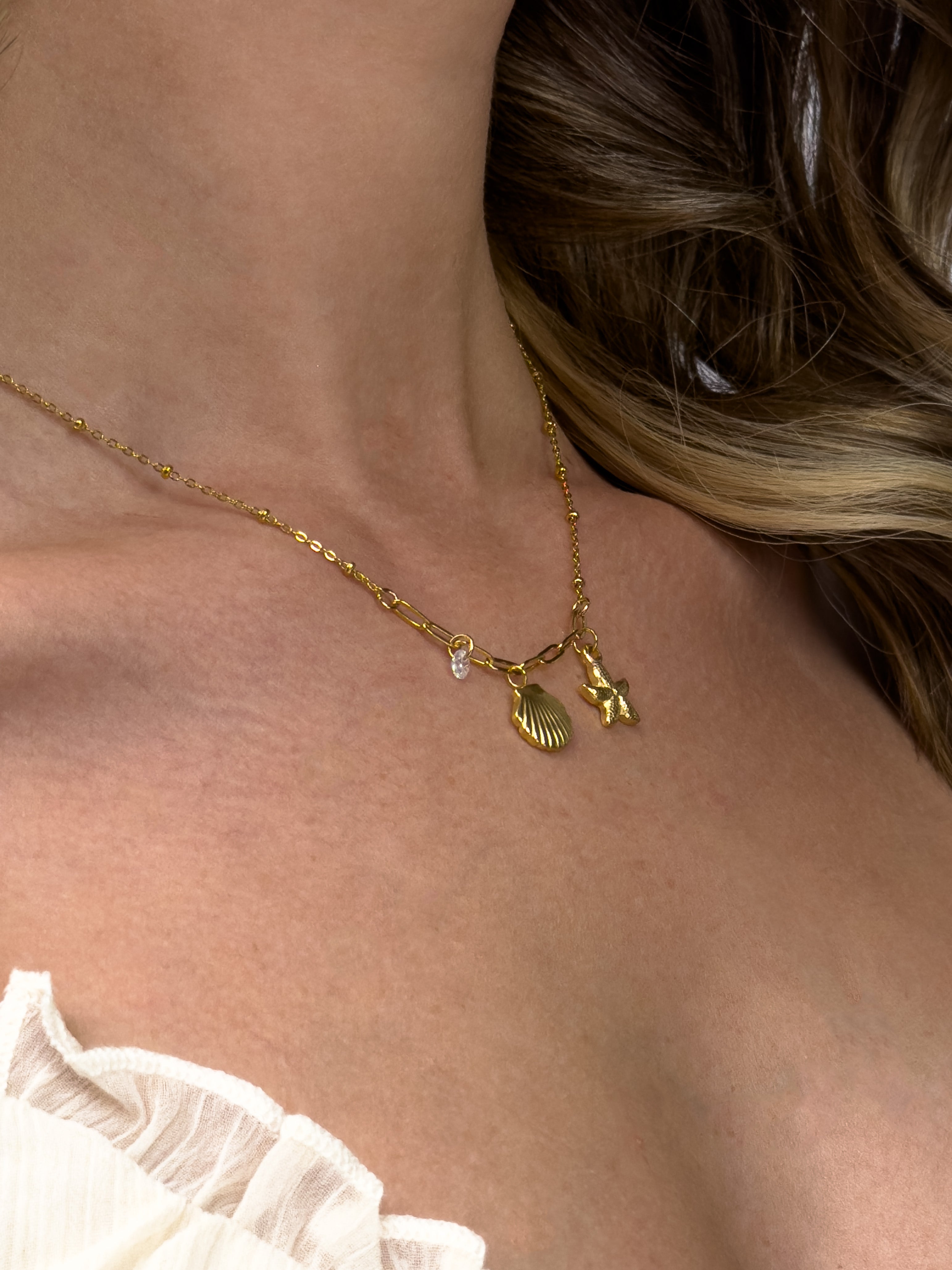 The Marisel Necklace captures the glow of the shore with delicate 18K PVD gold detailing. Featuring a sculpted seashell, a starfish charm, and a single crystal accent, it radiates effortless ocean elegance. Designed for everyday wear, it’s a timeless piece that brings coastal warmth and sophistication to any collection.